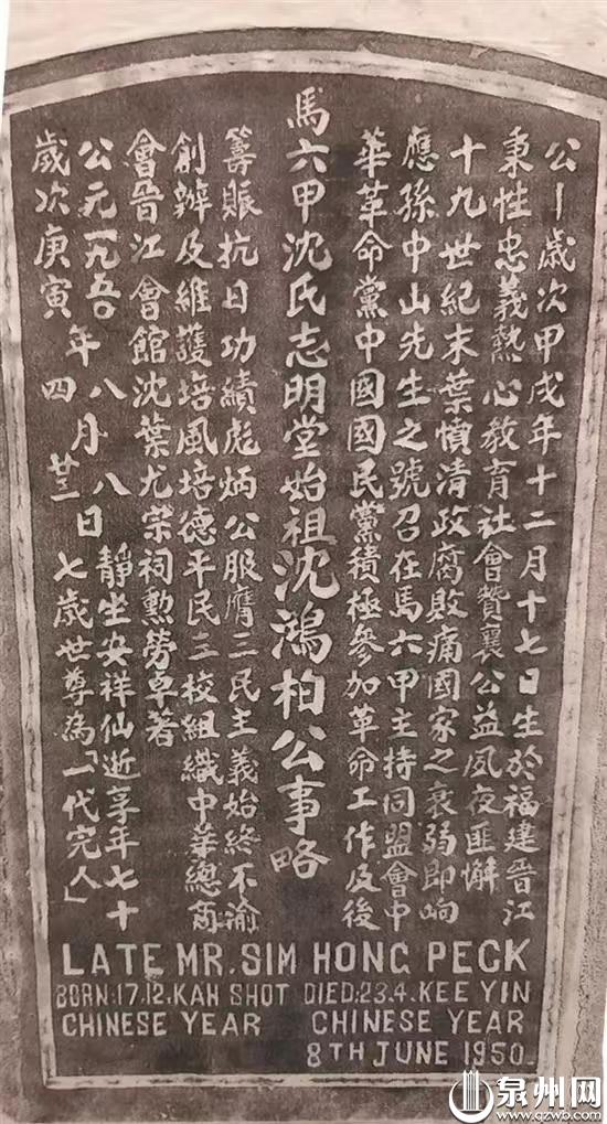 沈鸿柏,生于清同治十二年(1873年),其父为沈海筹长子沈廷献。1894年,沈鸿柏前往马来西亚襄助兄长鸿恩经商,后自立门户,从雇工垦荒到创办橡胶园、土产公司、印务公司,逐步发展成马六甲富商。身处海外,不忘家国,他曾担任同盟会马六甲分会主盟人(后改为支部长),被誉为“星马十大革命家”之一;积极发动其他华社侨领共同创办华文学校;创办马六甲第一份华文报《侨民周报》……