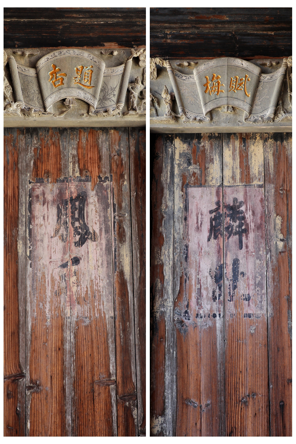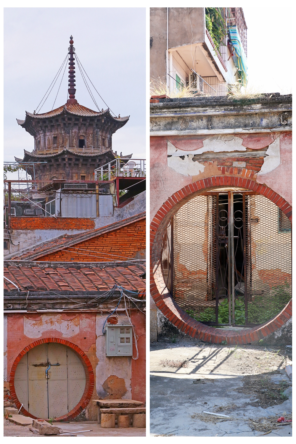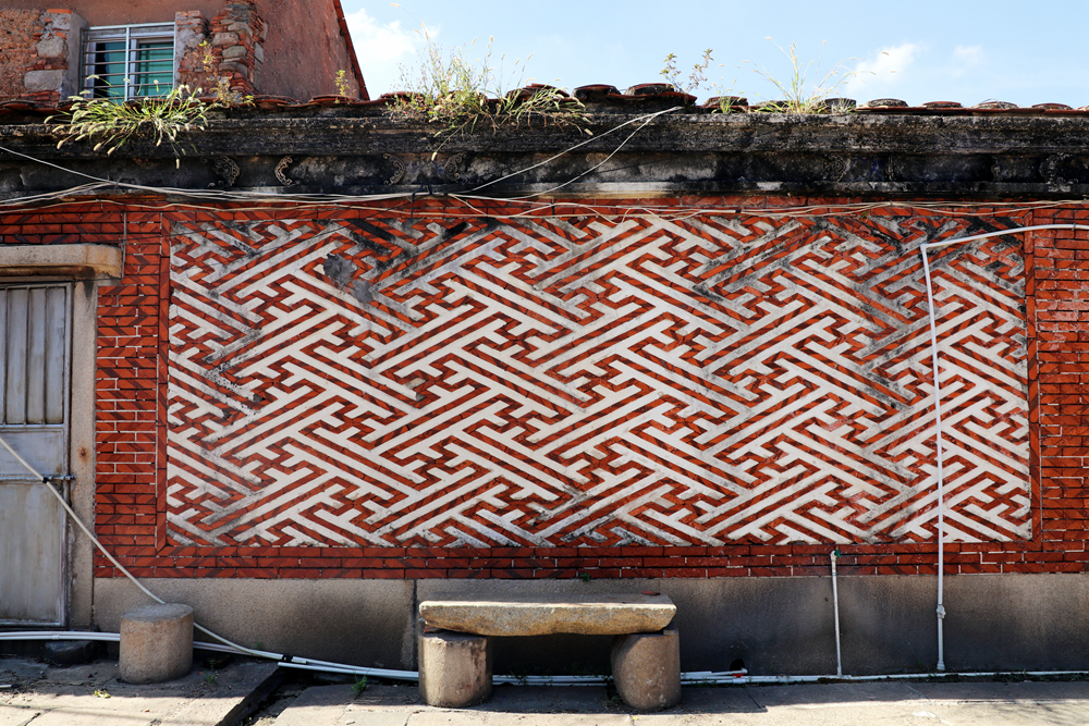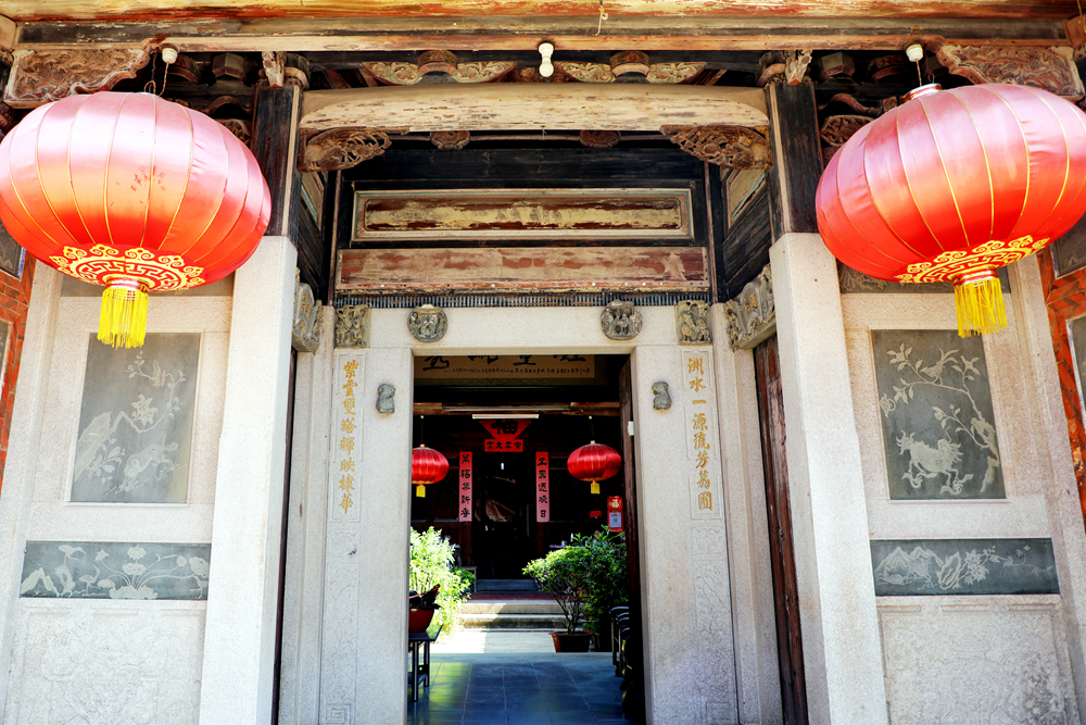 石埕两侧各有一个明清建筑风格的月洞门,配以书卷式门楣,门打开可通往外重护厝。石埕内还有两面墙值得一观,一面是双丁万字不断纹墙面,寓意多子多福、富贵绵绵;另一面则为出砖入石墙,红砖白石相间,极具侨乡特色。
