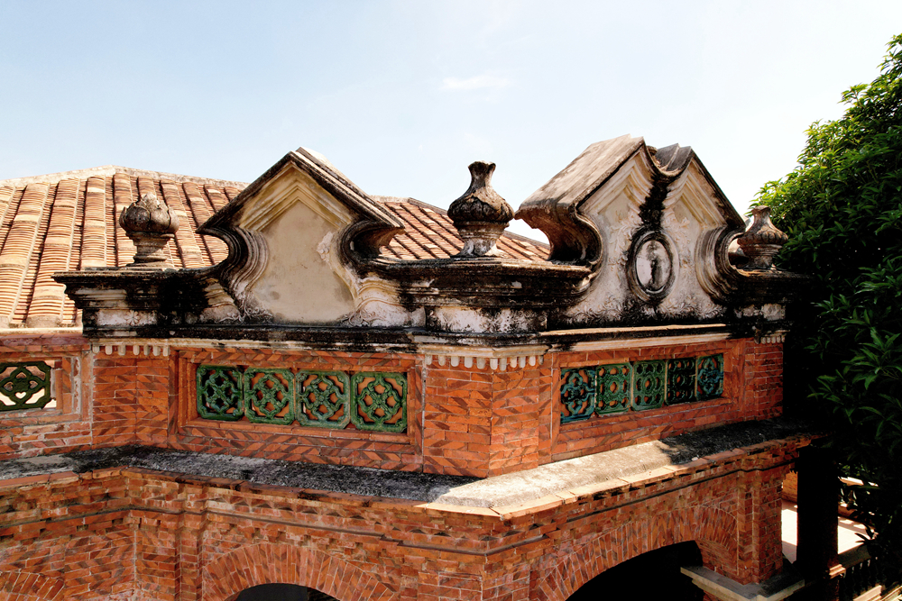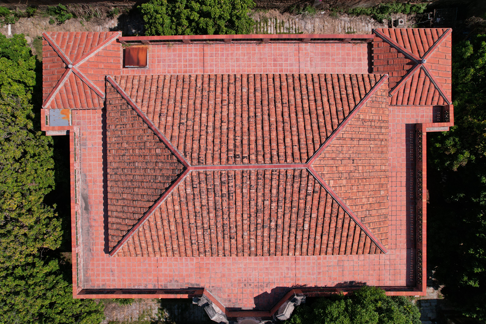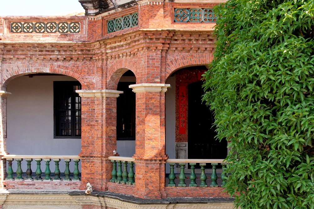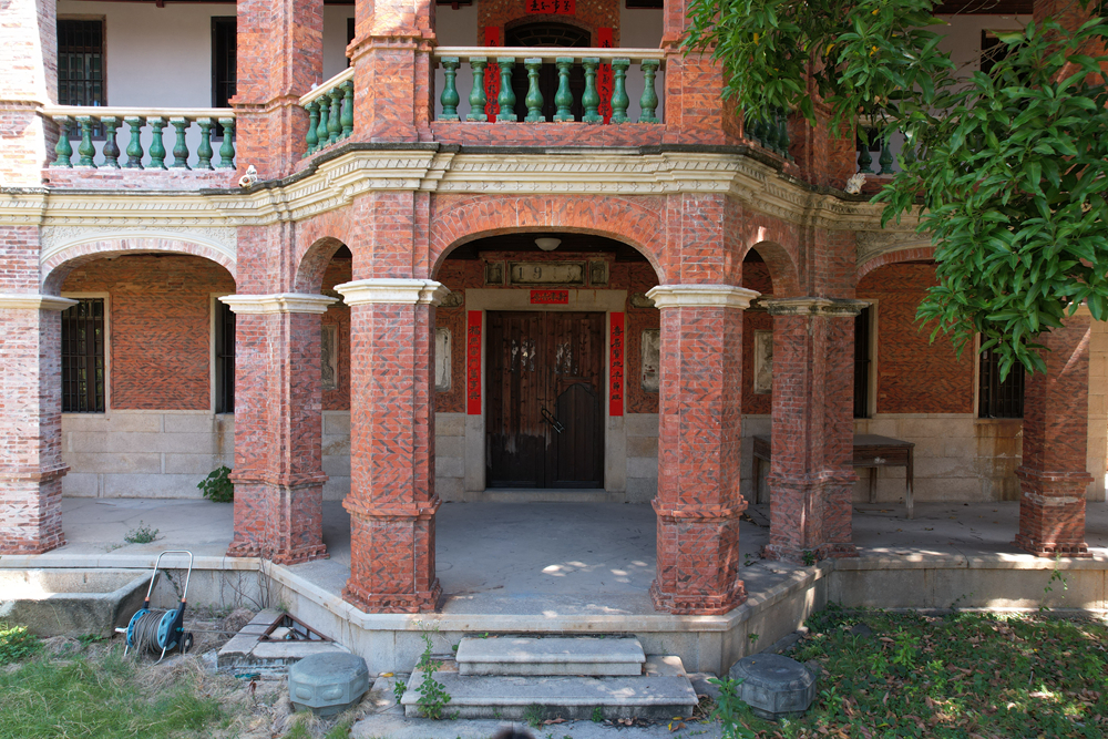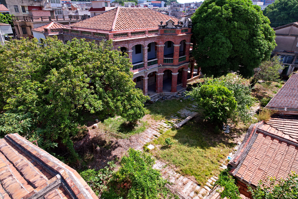 穿过官式大厝,向里走便是宋宅郁郁葱葱的后花园,园内绿植遍地,鹅卵石铺路,十来棵龙眼树环绕着中间的洋楼。洋楼坐北朝南,厅堂居中,两侧各有二间对称的房间;四面回廊环绕,一道道椭圆形拱顶与红砖廊柱相间,别有巴洛克风情;内部宽敞舒适,一楼和二楼各有四个大房间和一个大厅。