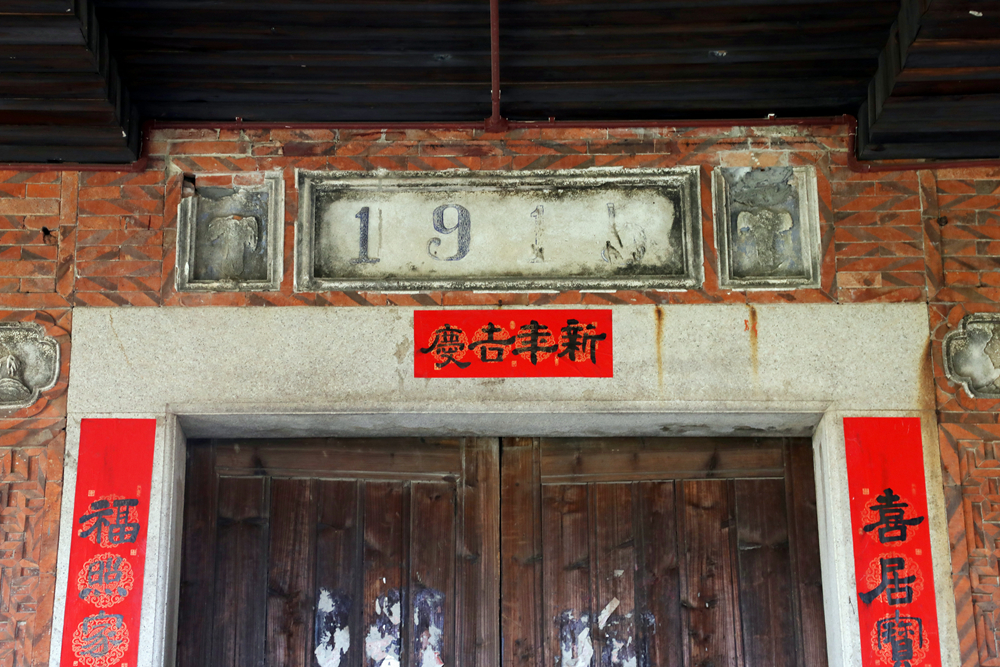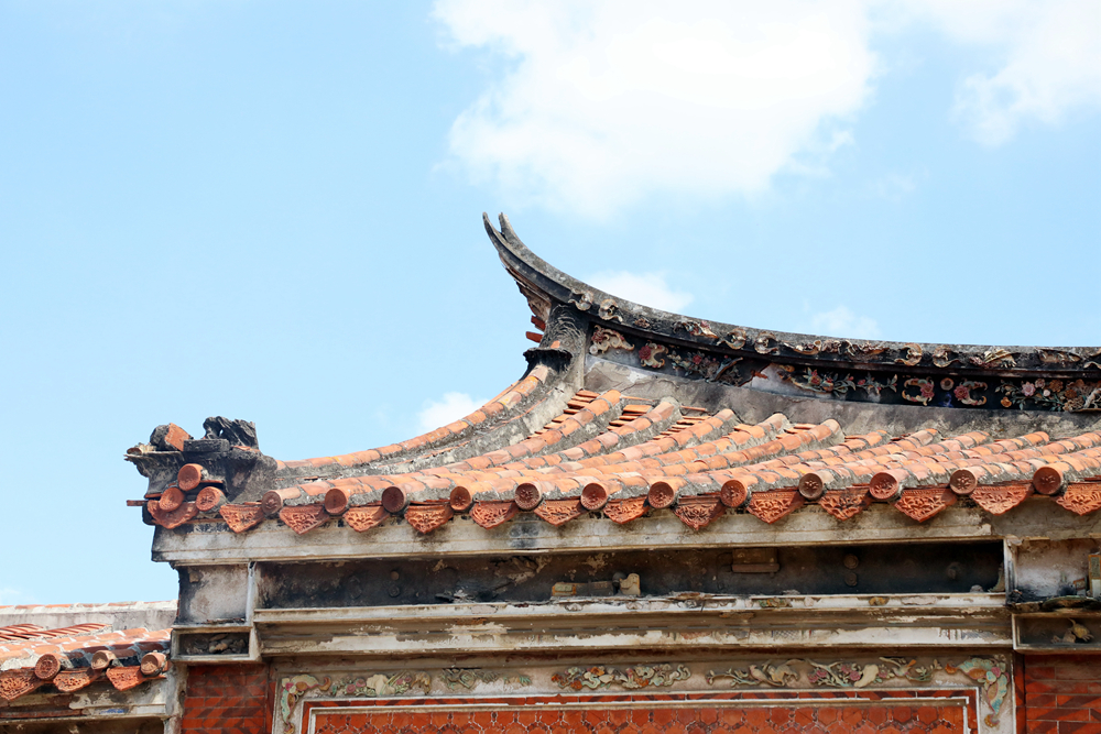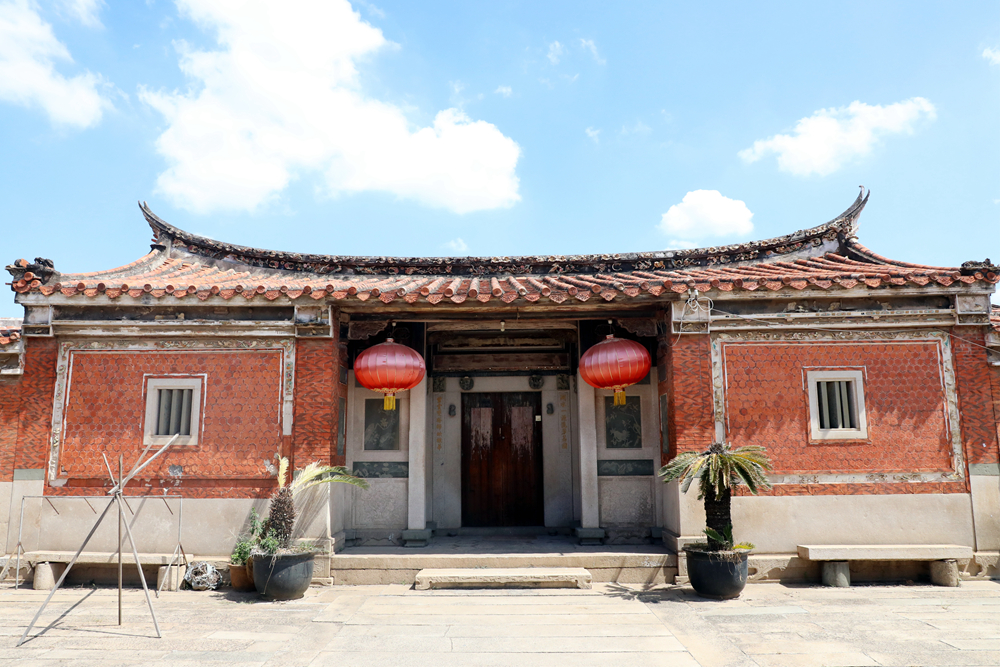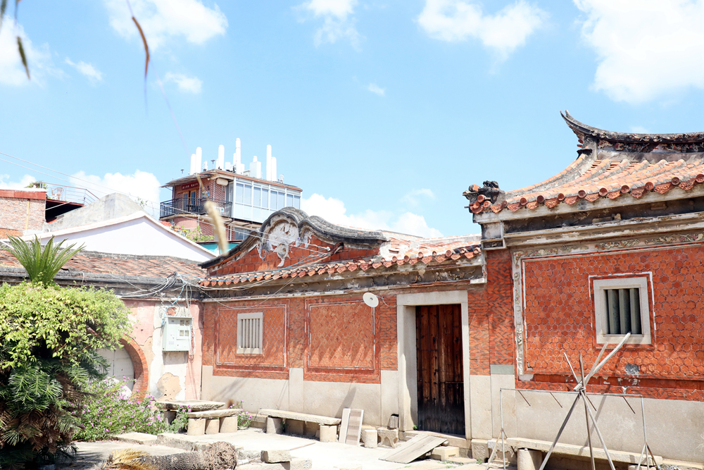 从石埕望去,大厝正面尽收眼底。红砖厝外墙立面装饰颇为讲究,硬山式山墙顶部站立仙人,搭配燕尾双脊,愈显精致;墙上雕梁画栋,瓷雕、木雕、砖雕等随处可见,造型各异。如今,这些雕刻构件已露陈色,但细看之下,精湛工艺仍令人叹服。