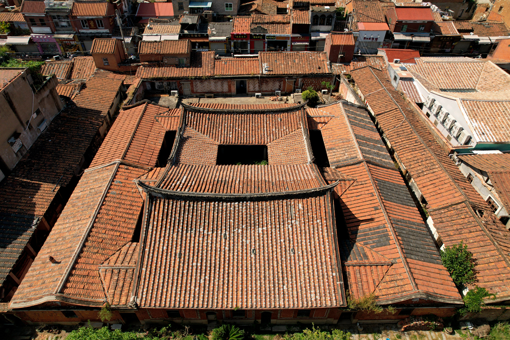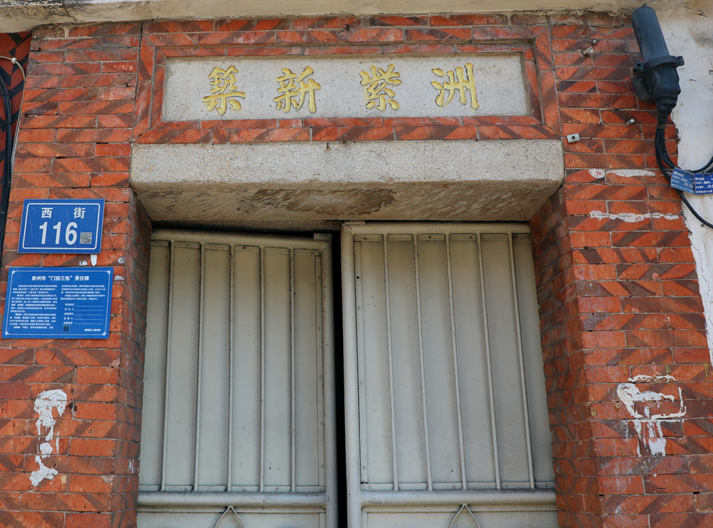洲紫新筑位于鲤城区西街116号,又称“宋宅”,距今已有百余年历史,入选福建省第一批城市优秀近现代建筑名录。从空中俯瞰,洲紫新筑呈长方形,中轴对称,布局巧妙,前半部分为两落三开间双护厝的官式大厝,尽显闽南特色;后半部分是绿树成荫、环境幽雅的后花园,园中另建双层西式红砖洋楼,独具异域风情。二者风格迥异却相互映衬,和谐共存。