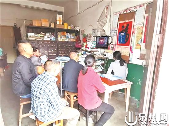 德化杨梅乡,村民们围在电视前关注大会盛况。
