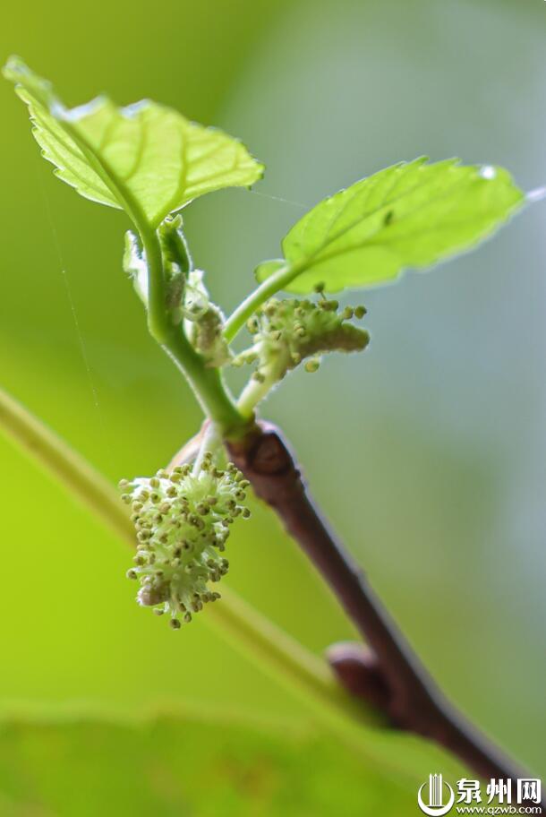 一名女子举起相机,想将蓝天白云下这一片苍翠永久收藏。不经意地,她惊呼而出,那绿意掩映间,竟是一朵盛开的桑花!无数淡绿色细细碎碎的小花围着一个中心轴成长,毛茸茸的,像极了一颗还未成熟的桑葚。