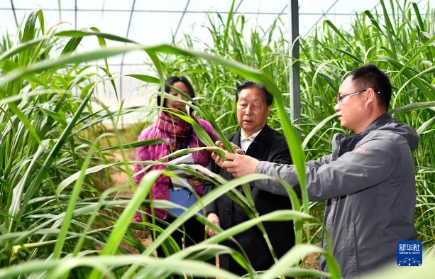 菌草专家林占熺(中)在宁夏银川市永宁县闽宁镇农户刘昌富的大棚里查看菌草生长情况(2021年3月29日摄)。新华社记者 王鹏 摄