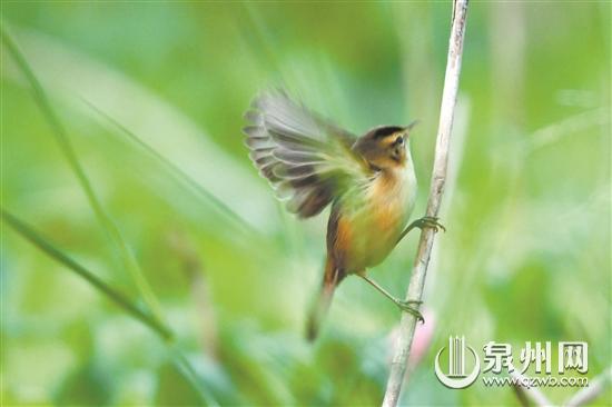 泉州网10月20日讯 (记者许钹钹)“唧唧唧……”近日,在晋江九十九溪,一阵短暂而急促的鸟叫声从芦苇丛传出。在一片绿色的映衬下,一只身披棕褐色羽毛、扫着淡黄色眉纹的鸟儿引起了泉州市观鸟学会成员董帝伟的注意,他迅速按下了快门。经专家辨认,这鸟是黑眉苇莺,是在泉州发现并被正式记录的第335种鸟类。