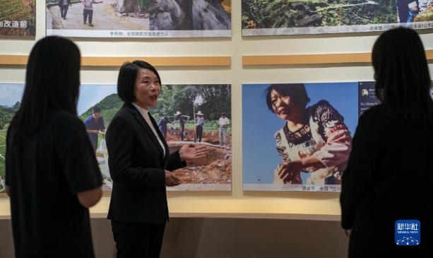 二十大代表谢成芬在云南省西畴县“西畴精神”展览馆里讲述治理石漠的故事(2022年3月26日摄)。新华社记者 江文耀 摄