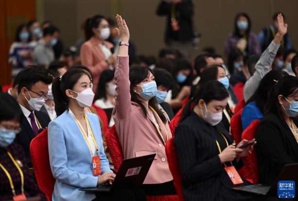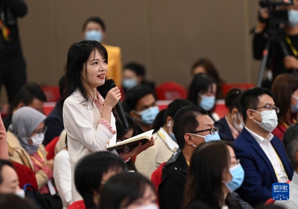 这是记者在分会场举手提问。新华社记者 金良快 摄