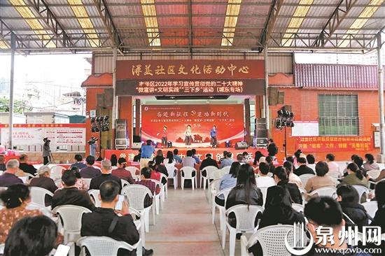 泉州网11月4日讯 (记者 李菁 通讯员 郑晓岚 文/图)微党课、文艺展演、面对面宣讲……11月2日下午,“奋进新征程 建功新时代”——丰泽区学习宣传贯彻党的二十大精神“微宣讲+文明实践”“三下乡”活动在城东街道浔美社区开展。此次活动采用微宣讲、线下宣传互动打卡、文艺展演相结合的形式,面对面、小切口、互动式把党的二十大精神送到基层。