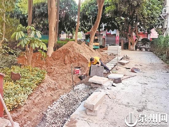 随后,记者来到释雅山公园。林先生反映的地点位于公园靠万厝埕公寓一侧,现场的绿植已经被铲除,工人正在铺设石板材。一名工人告诉记者,他们是在加宽路面,方便小车进出公园。