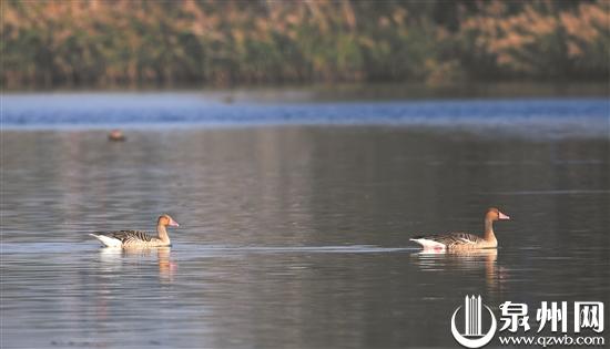 11月13日上午,观鸟爱好者陈文森在泉州台商投资区百崎湖观鸟时,发现有两只不同于其他水鸟的大型鸟类正在湖面上悠闲地游泳,他及时记录下影像和图片。后经观鸟学会对照片及记录进行比对研究、泉州市林业局相关人员确认,他拍到的是首次出现在泉州的灰雁。