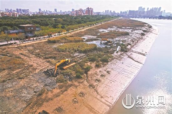 泉州网11月16日讯 (记者张素萍 通讯员李莹 李蓬源 文/图)14日,在鲤城区海滨街道新华旱闸附近的滩涂上,两台挖掘机正忙着清除互花米草。随着鲤城区互花米草除治工作进入尾声,晋江流域鲤城段沿岸重现美丽生态岸线景观。