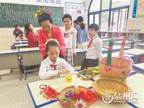 近年来,临海小学不断探索课后服务模式,设置了丰富的课后服务活动。除常规的体育、艺术、科技等兴趣班外,学校因地制宜,挖掘地方优势和资源,推出了以培养学生兴趣、提高学生动手能力、促进学生全面发展为目的的蟳埔女头饰制作班,并聘请了社区有蟳埔女头饰制作经验和专长的人担任校外辅导员,每周三定期到学校上课。在头饰制作的培训过程中,束发、盘发、插花等操作不仅锻炼了学生的动手能力,陶冶了审美情趣,更让传承优秀非遗文化以劳动教育的形式在校园内全面铺开。学校因“蟳埔女头饰制作”特色还曾被确认为“第二批全国中华优秀文化艺术传承学校”。
