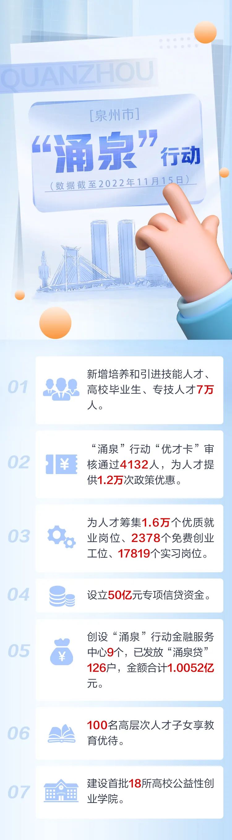 “让人才成就泉州,让泉州成就人才。”“选择泉州,与泉州共创未来。”“无论是人才‘港湾计划’,还是‘涌泉’行动20条,都饱含泉州‘尊才爱才重才’的满满诚意、浓浓暖意。”……特别是今年6月,泉州重磅推出“涌泉”行动20条政策“干货”,涉及就业岗位、住房保障、子女教育、生活补贴、社保补助、创业支持、引才奖励等方方面面,力促人口、人力、人才资源转化贯通,全力打造青年人才向往地、青年发展友好城、创新创业首选地。