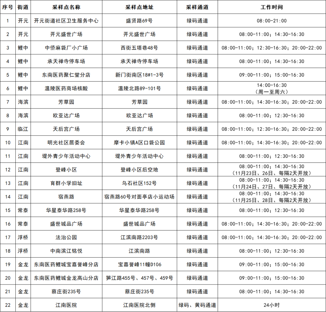 为进一步满足群众核酸检测需求,优化核酸采样服务,11月23日起,鲤城区对核酸采样点进行新一轮调整,公布24个核酸采样点名单。请有需要的市民游客注意各点位服务时间,按需前往检测。