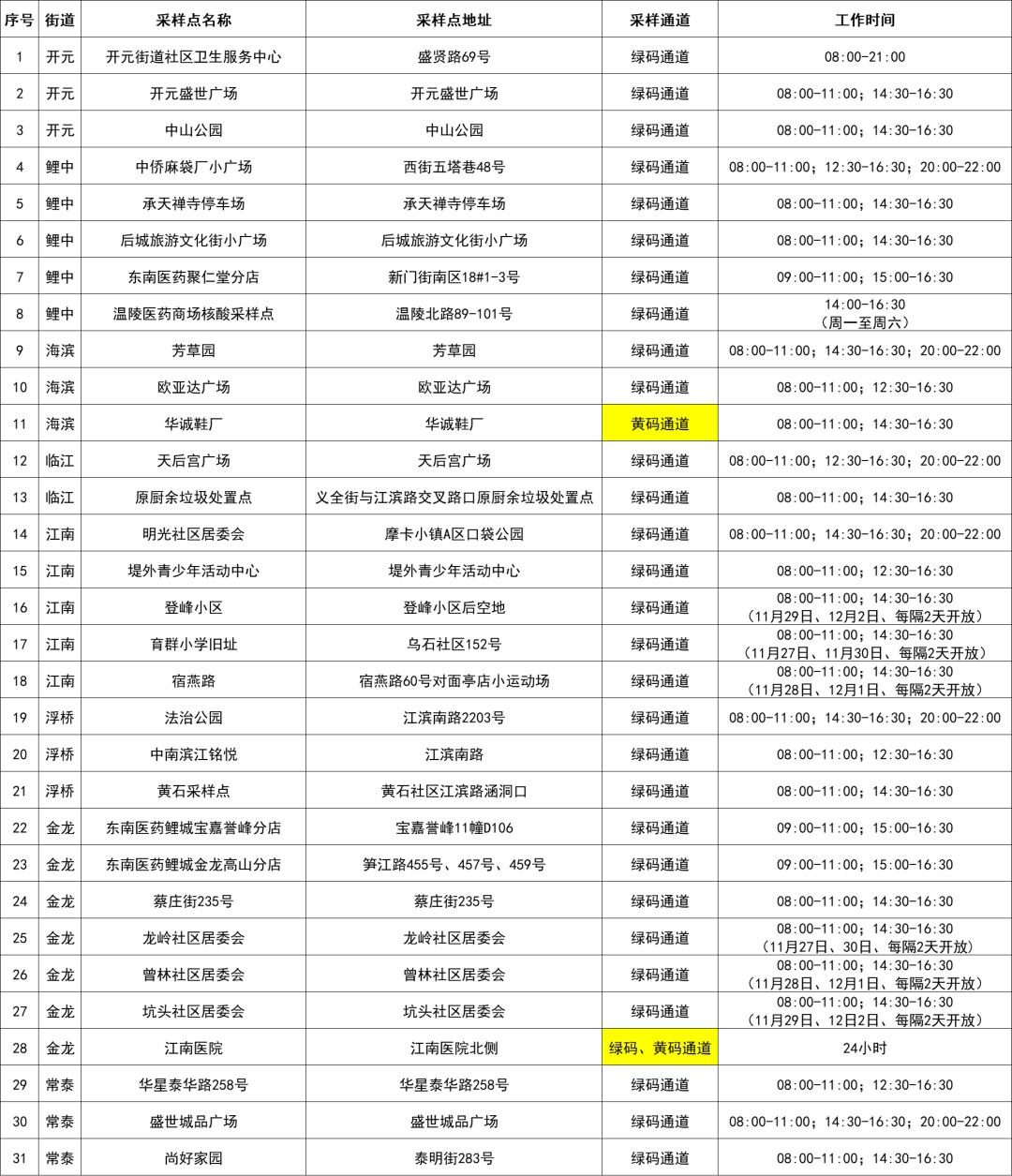 备注:(1)江南医院采样点环境消杀时间为6:30-8:10;11:40-13:00;16:30-17:50;23:00-次日0:10。11月27日、28日因信息采集系统升级,00:00-03:30暂停采样,请勿跑空。(2)因点位设置需要,浮桥街道黄石采样点、常泰街道尚好家园采样点,11月27日14:30起开放采样。