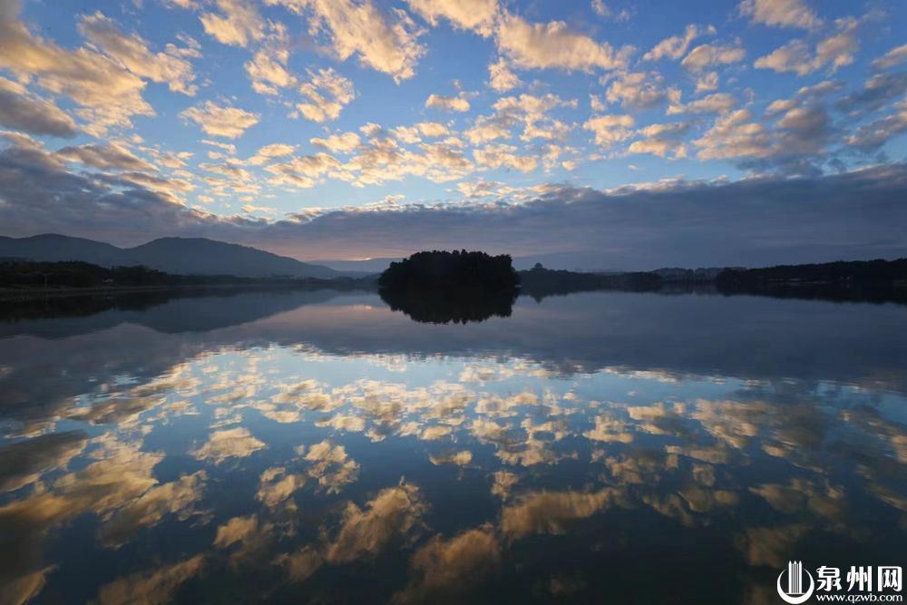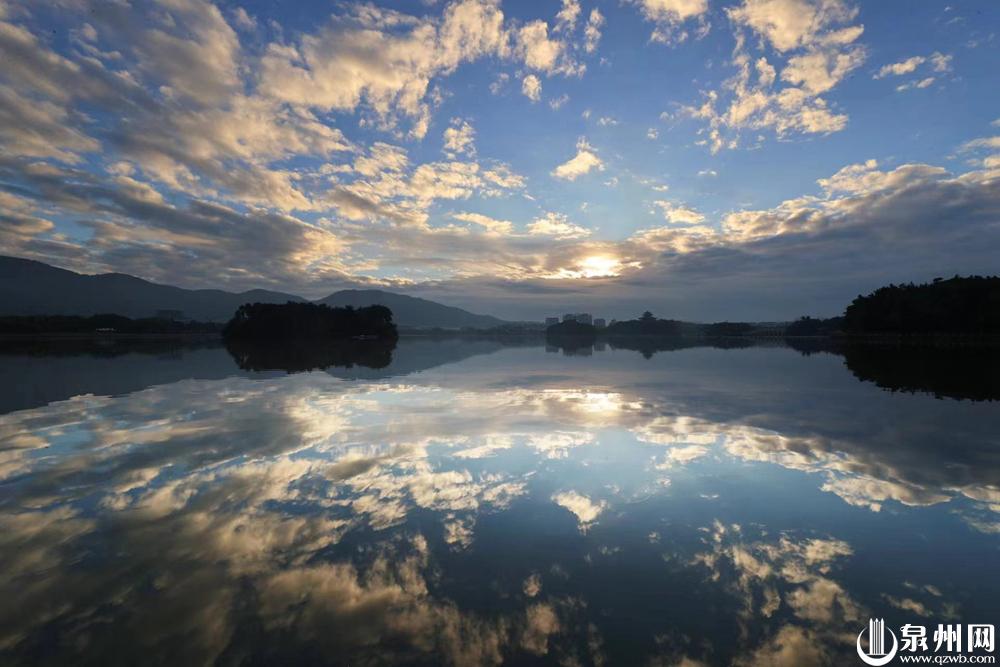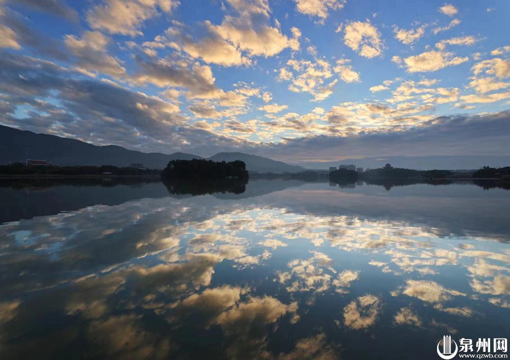 泉州网12月4日讯(记者 王柏峰 文/图) 12月4日清晨,泉州西湖出现“天空之镜”的独特景观,湖面宛若一面镜子,将蓝天、白云投映在湖面上,水天一色,美不胜收。
