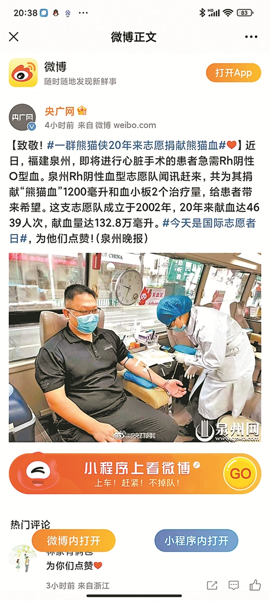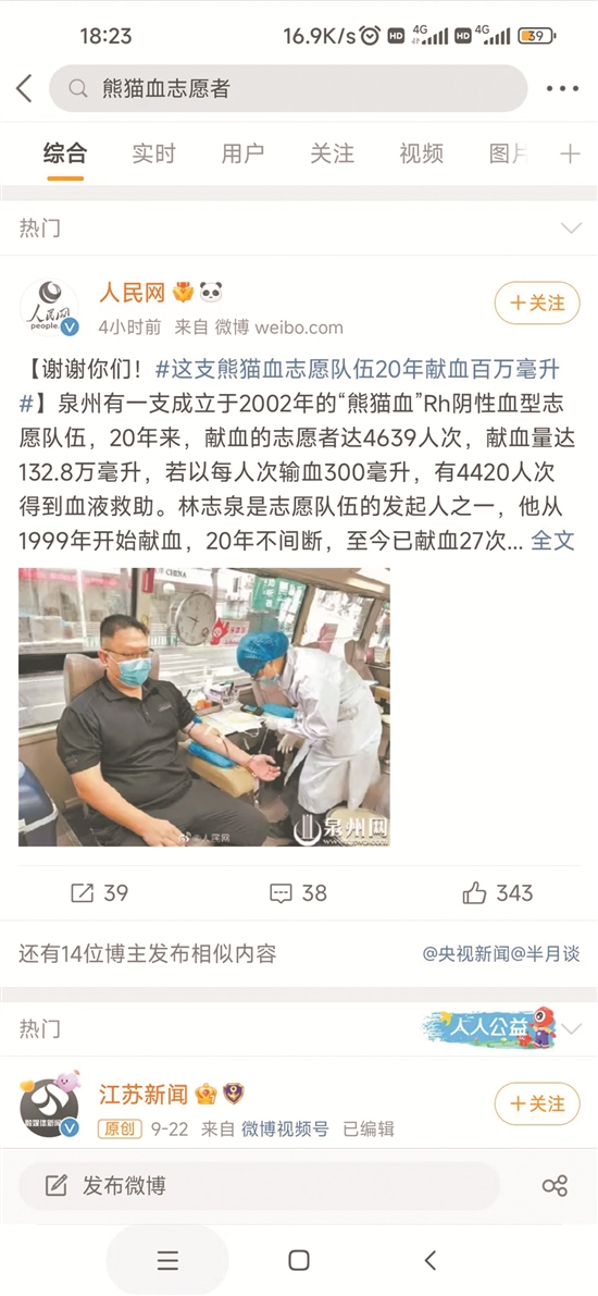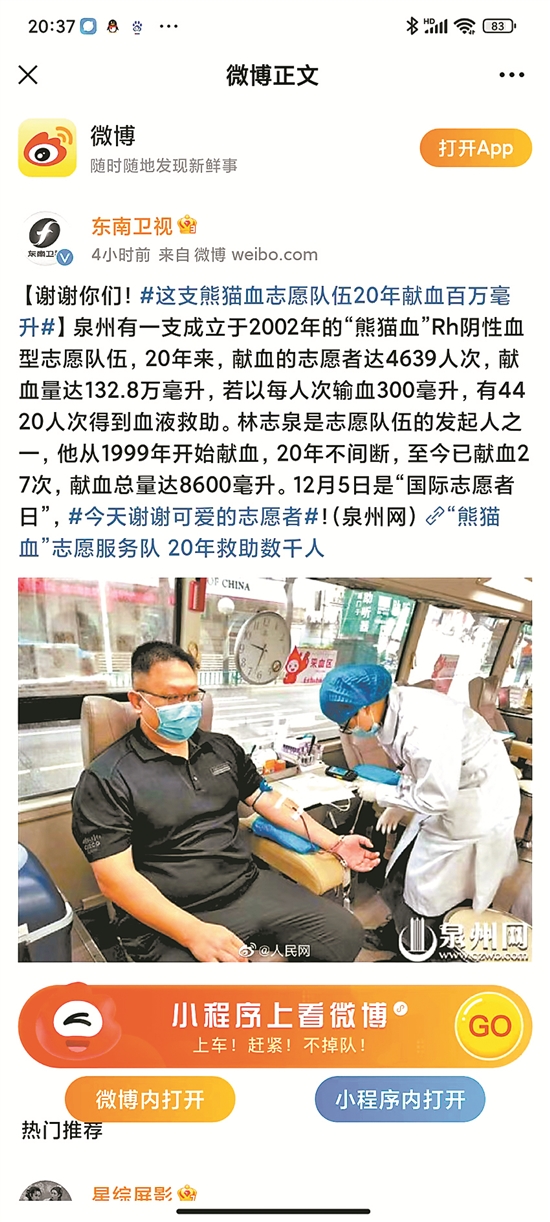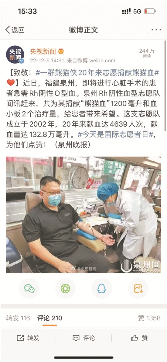 泉州网12月6日讯 (记者廖培煌 通讯员许艺斌)昨天是第37个“国际志愿者日”,泉州晚报报道的泉州市红十字Rh阴性血型志愿服务队事迹,微博上,@人民网、@央视新闻、@半月谈、@央广网、@东南卫视等媒体,以《致敬!一群熊猫侠20年来志愿捐献熊猫血》或《谢谢你们!这支熊猫血志愿队伍20年献血百万毫升》为题,转载泉州晚报及泉州晚报社新媒体报道,向志愿者致敬。光明网、搜狐网、东南网等门户网站也给予转载。