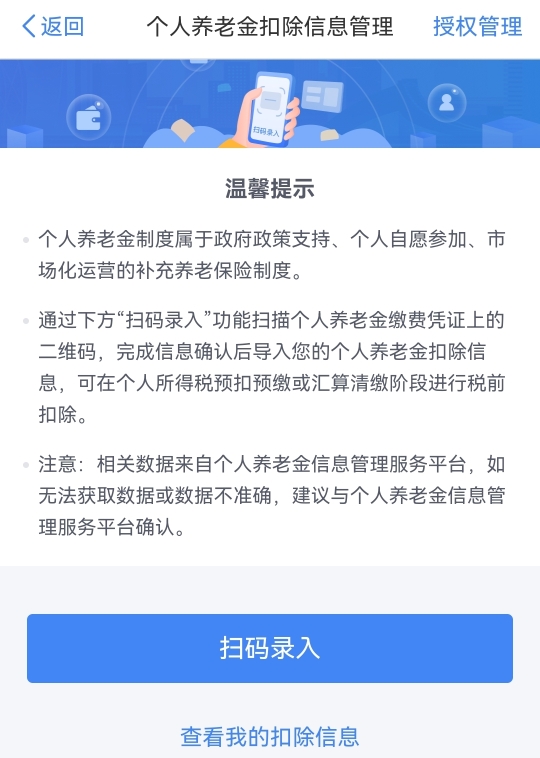 纳税人通过 “扫码录入”功能扫描个人养老金缴费凭证上的二维码,完成信息确认后导入个人养老金扣除信息,可在个人所得税预扣预缴或汇算清缴阶段进行税前扣除。