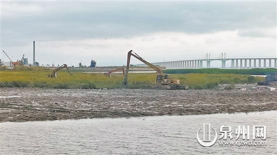 大型机械正在界山海域清理互花米草 (泉港区自然资源局 供图)