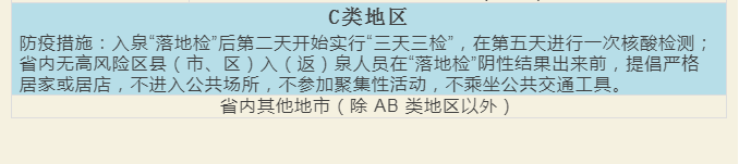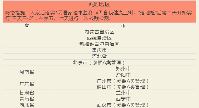 所有入(返)丰人员在落实“落地检”后,根据出发地和途经地疫情风险等级接受分类管理(地区分类及健康管理措施根据省内外疫情形势动态调整,详见附表一)。