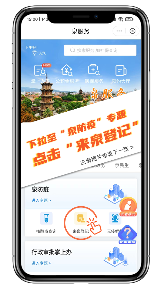 入(返)丰人员应提前通过“来泉登记”小程序(支付宝或泉服务平台可进入)或向目的地社区、用人单位如实申报个人信息、抵达时间、交通工具、目的地和健康状况等信息,落实好我区疫情防控各项要求。未提前报备的,须在抵丰后3小时内进行补录报备。