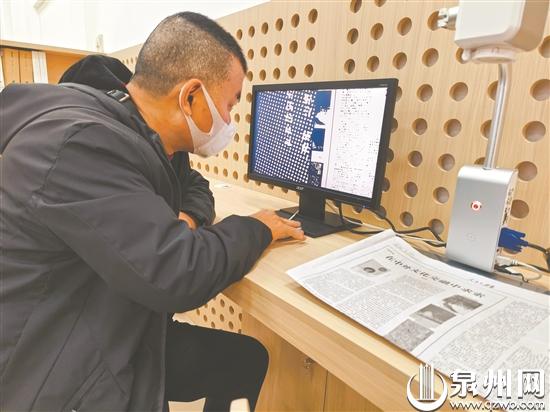 上午9点多,记者在晋江市图书馆中心馆一楼看到,面积62平方米的“零障碍阅读文化空间”内摆放着4台视障专用电脑、1台一键式盲人阅读机、1台朗读型台式助视器、1台远近两用电子助视器、4台盲人听书机、5台现行盲文学习机等高科技视障阅读设备,空间四周的书架上摆放着各类盲文书籍。为了方便盲人在该文化空间内自由行走,地上还贴心地安装了盲道。
