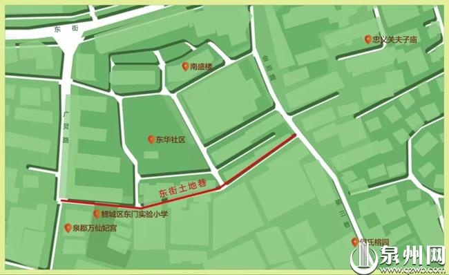 泉州鲤城区东街土地巷,又名菜巷土地巷。该巷原有一座土地庙,故称土地巷,为了与古城其他土地巷区别,前面加了“东街”二字。东街土地巷西接菜巷,东抵金池巷与第三巷交界处。这里地处古城东隅衮绣铺广灵境,历来名人辈出。