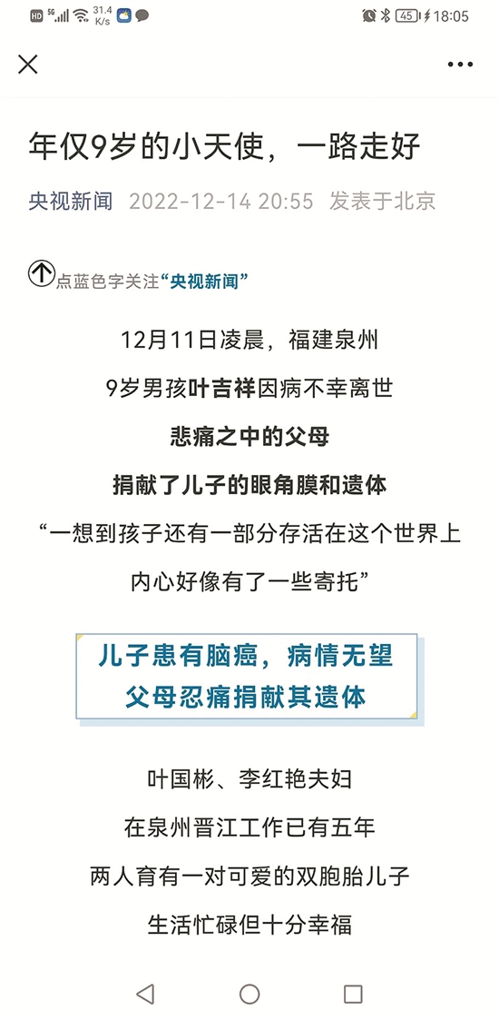 泉州网12月16日讯 (记者张晓明 文/图)“一想到孩子还有一部分存活在这个世界上,内心好像有了一些寄托。”今年4月,叶国彬、李红艳夫妇替患有癌症的儿子签署了遗体捐献志愿书,以期让儿子生命得到延续。12月11日凌晨,9岁男孩叶吉祥不幸离世,悲痛之中的父母捐献了儿子的眼角膜和遗体。14日晚上,央视新闻在官方微信公众号头条推送叶国彬一家的感人事迹,引发全国网友关注。