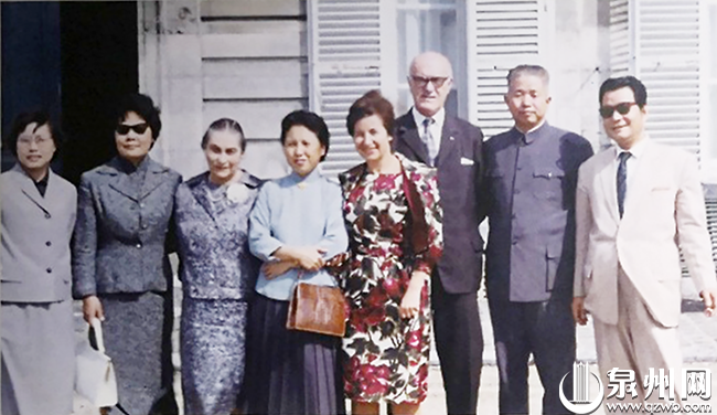 司马文森(右一)担任驻法文化参赞时,与驻法大使黄镇(右二)、法中友协名誉会长蒙博(右三)等合影。