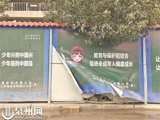 14日上午9时30分许,记者在泉州中心市区通港西街一处建筑工地看到,固定的围挡已经拆除,施工方临时用铁皮代替,贴在上面的公益广告局部出现破损、脱落,有的地方还被贴上了小广告。