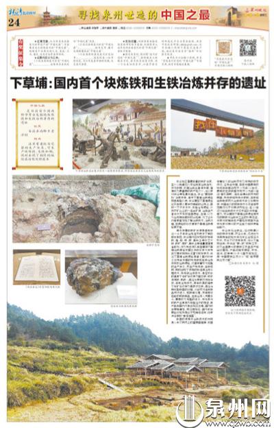 安溪青阳下草埔冶铁遗址是首个国内科学系统考古发掘的块炼铁和生铁冶炼并存的冶铁遗址。这里有着较为完整的生产体系,可生产块炼铁、生铁和钢,同时出现了独特的板结层冶炼处理技术。块炼铁冶炼技术,是在较低的温度下将矿石还原为固态铁(或称海绵铁、熟铁),再经反复锻打去除杂质。生铁冶炼技术,是在较高的温度下将矿石还原为高碳液态铁,再经浇铸成型铁器的过程,之后可对生铁制品进行退火、脱碳等处理,获得更好性能的钢铁制品。
