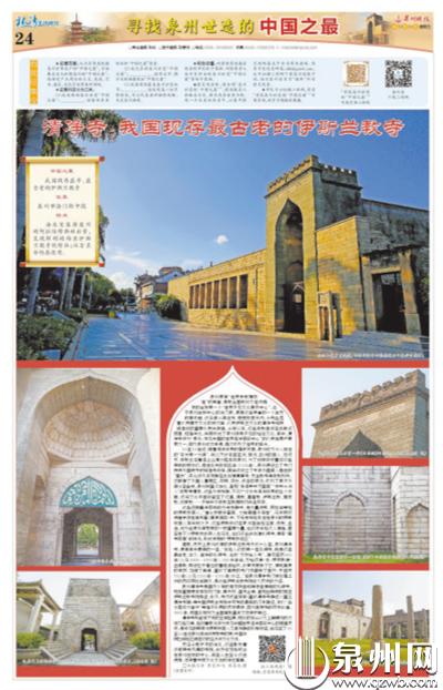 位于泉州市涂门街中段的泉州清净寺由北宋客居泉州的阿拉伯穆斯林出资建造。清净寺是国内少有的用花岗岩和辉绿岩建造的礼拜寺,现存重要遗存有石构门楼、奉天坛、望月台等,呈现出鲜明的西亚伊斯兰教寺院特征。此外,寺内还留存有《重修清净寺碑记》《重立清净寺碑》等中国伊斯兰寺院中可考的最早的汉字碑记、宋代“出水莲花大香炉”等诸多珍贵的历史遗存。因为其特殊的历史价值,1961年,被国务院列为全国首批重点文物保护单位。