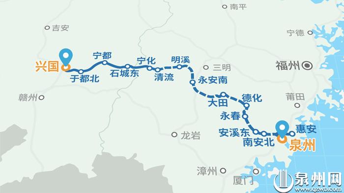 兴泉铁路起自京九铁路兴国站,经江西省赣州市,福建省三明市、泉州市,终至福厦铁路泉州站,全长464公里,设计时速160公里,为国家I级单线电气化铁路。