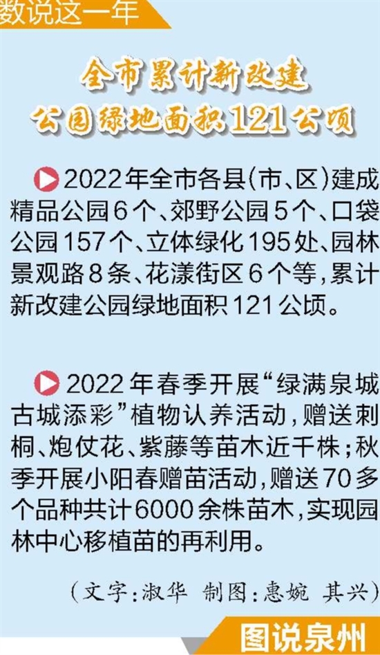 2022年是泉州市“绿满泉城”三年行动的第一年。以满足人民群众日益增长的优美生态环境需求为出发点,市城市管理局按照“300米见绿、500米见园”目标,持续推进“山水园林、文化园林、百姓园林”+门户廊道建设,取得了阶段性成效。