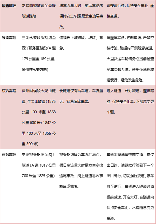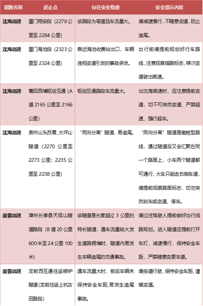 1.厦蓉高速海沧枢纽至玉兰枢纽路段,包含天成山隧道、陈巷枢纽等事故多发易发路段,请驾驶人提前做好出行线路规划。