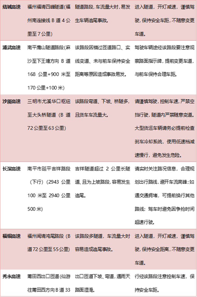 2.甬莞高速福州段透堡服务区至大帽山隧道口部分路段路面沉降,跳点较多。京台高速B道1861公里至1866公里为长上坡弯道,右侧车道货车行驶速度较慢易导致缓行,注意保持安全车距。