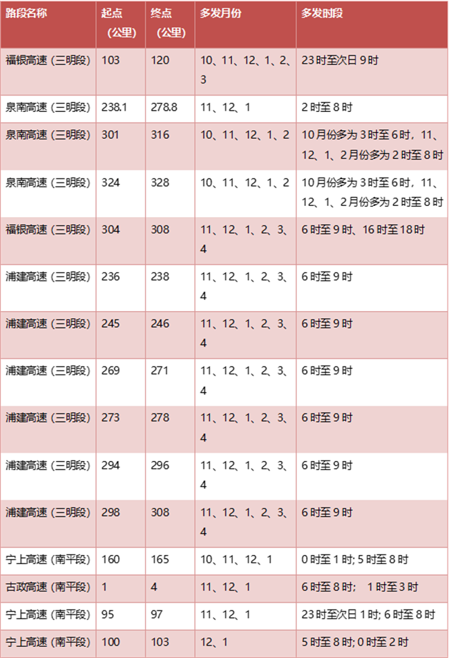 全省高速公路团雾路段(24处)