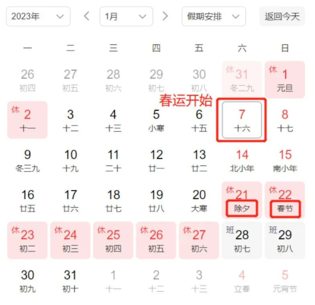 2023年春运从1月7日开始至2月15日结束,为期40天。