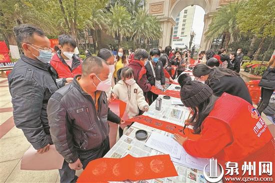丰泽区城东街道泉铁社区的书记兼主任杜翠兰也来到现场领取春联。“我们社区之前也会组织送春联的活动,这种活动很受群众欢迎。不过今天我是作为文明家庭的代表来领春联。”原来,他们一家是泉州市第二届文明家庭,当天她到现场领春联,准备送给其他文明家庭。