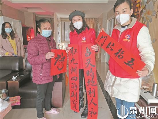活动接近尾声时,泉州市妇联和丰泽区妇联的相关负责人带着“新鲜出炉”的春联及慰问品,走进小区群众家中,给她们送上新春祝福。“慢慢养身体,多多休息。”市妇联相关负责人得知肖阿婆生病刚刚康复,关切道。“多谢多谢,感谢你们特地入户来给我们送春联。”阿婆拿着春联,热情地招呼大家。