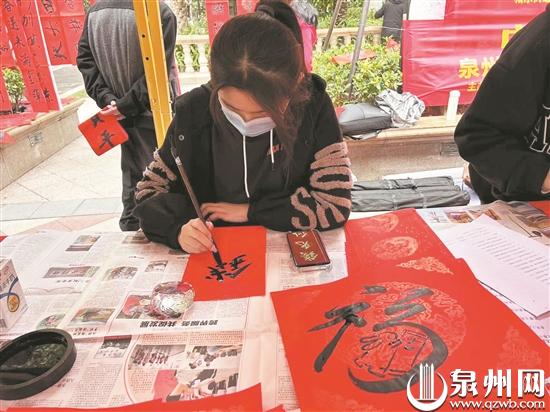 一到现场,丰泽区书法家协会副主席许春颖便铺开红纸,一支毛笔,一方砚台,挥毫泼墨,笔走龙蛇。她告诉记者,每年她都会到各个地方义务写春联,这已经是她近期参加的第七场送春联活动了。“我写书法已经几十年了,每年都会参加十几场。之所以坚持参与义务写春联活动,也是想把自己所学的、自己喜欢的书法发挥出来,为老百姓做点力所能及的事情,传播我们的传统文化,也体现我们书法家的情怀。”许春颖说,即使写完后容易腰酸背痛,但在这种特殊时期,她依然想把自己对群众的祝福写到春联中,预祝大家都能过个好年。