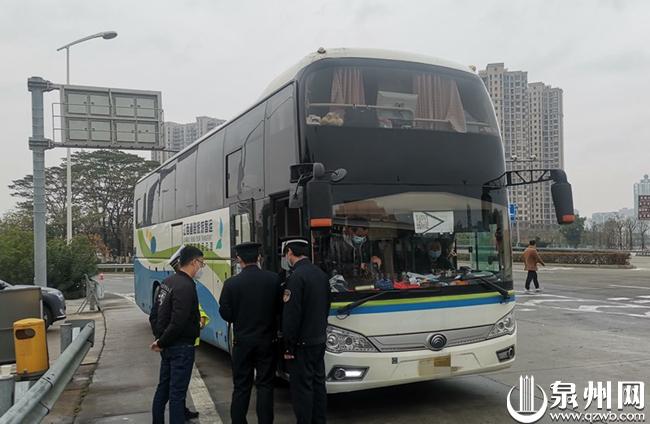 1月12日7时05分,一辆湘L牌的大巴车停靠在国道324线路边上客。发现执法车后,大巴车司机想尽快驶离,但被泉州市交通运输综合执法支队执法五大队的执法人员及时依法拦停。