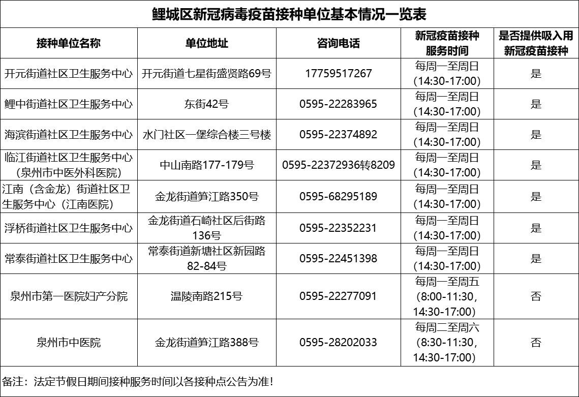 为了更好地向感染高风险人群、60岁及以上老年人群、具有较严重基础性疾病人群和免疫低下人群提供第二剂次新冠疫苗加强免疫接种服务,同时为尚未完成基础免疫和第一剂加强免疫接种的市民朋友们继续提供接种服务,鲤城公布9个新冠疫苗接种点,其中7个接种点提供吸入式新冠疫苗接种服务。市民朋友们可根据实际需求选择附近的接种点前往咨询、接种。