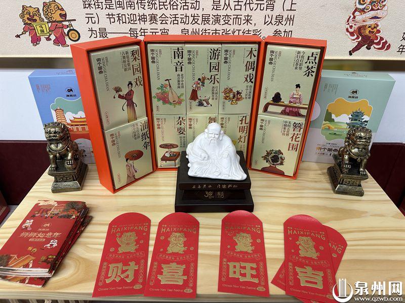 在福建海西坊食品科技有限公司,陈列着一排排极具世遗泉州文化美感的产品,施江淮董事长介绍说,以公司的“宋个茶点”的产品来说,谐音“送个茶点”,希望打造一场宋代茶点美学的视觉盛宴。宋个茶点从传统文化中吸取精华,取自八闽风物的妈祖、兴化军、福船、土楼、建盏、东西塔等元素,在礼盒上聚集出一幅宋时八闽景象。一件件精致礼盒,成为闽派文化的使者,可以看见宋元以来的人文变迁与风俗传承。