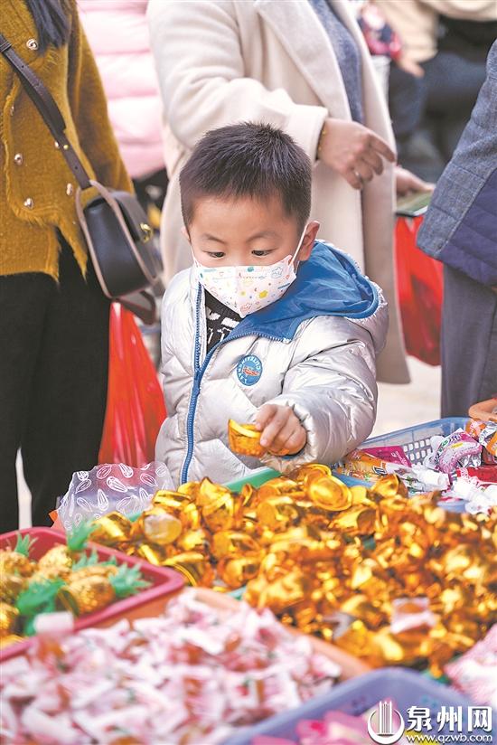 昨日,在安溪县龙涓乡下洋街道,年货集市热闹非凡。众多村民前来赶圩、办年货,迎接春节。图为一位小朋友在家长的带领下选购元宝造型的糖果。(李雅真 李雅琴 摄)