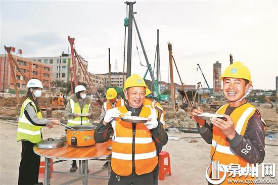 1月21日,在泉州知创产业园项目工地,坚守施工一线的工友们吃着热乎乎的饺子。(张九强 摄)