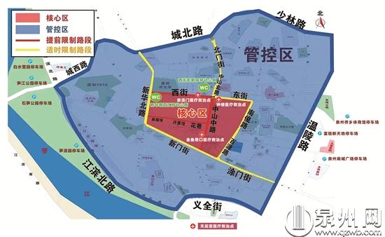 城西路、城北路、少林路、温陵路、义全街、江滨北路合围区域为管控区,管控区内将根据交通流量情况,适时采取分流管控措施。