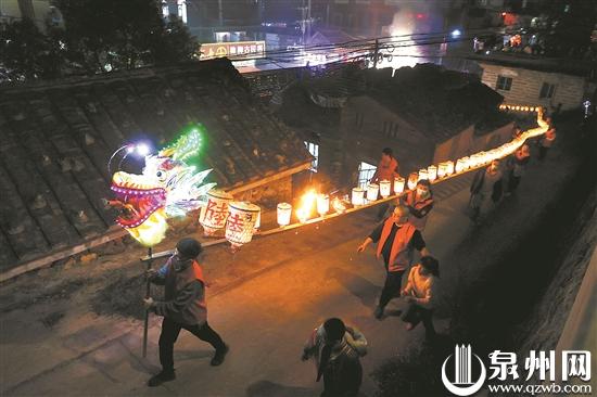 泉州网2月5日讯 (记者吴志明 黄墩良)锣鼓喧天、鞭炮齐鸣,两条“龙灯”游走在山村的村道上,祈愿村民新一年平安……2日晚上6点多,作为每年农历正月十二日晚上的保留节目,龙灯游村活动都会在安溪县龙涓乡山后村热闹举行。