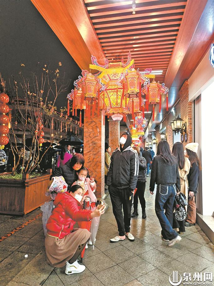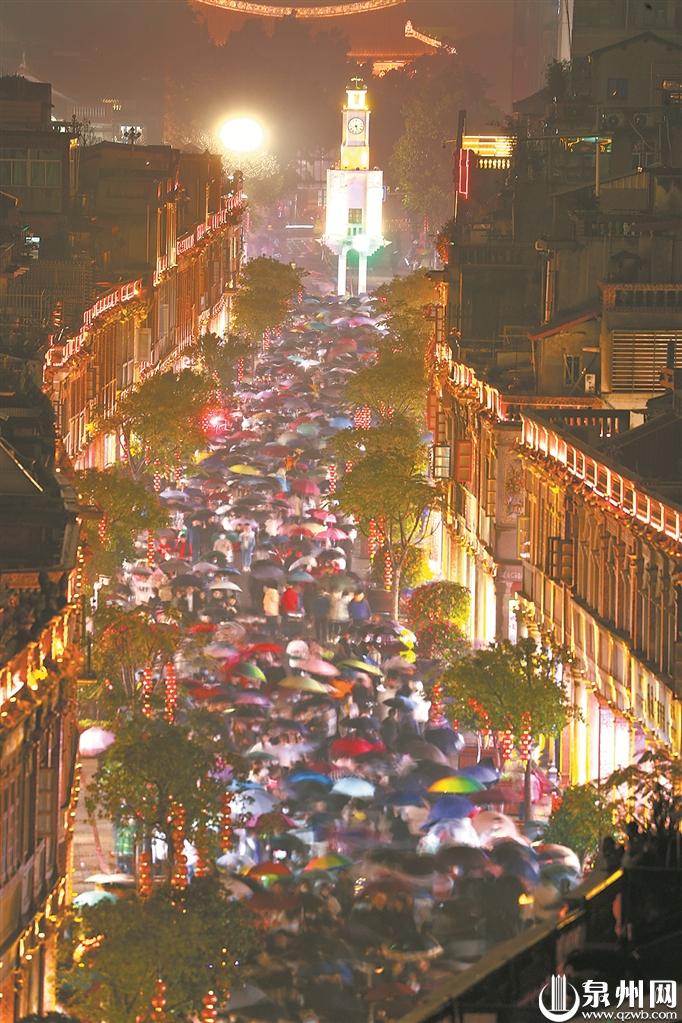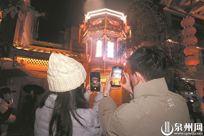 “来泉州游玩看花灯,肯定得来西街、开元寺逛逛啊。”小丽和几个朋友专程从厦门来泉州过元宵,她们撑着雨伞,漫步在西街。看着古色古香的老街,她感叹道,在泉州中心城区能完好地保留着老街区,实在太难得了。