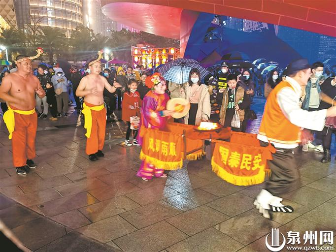 7时许,一场“火鼎公婆”表演赢得了现场市民游客阵阵掌声。表演者扮相夸张,表情诙谐,在欢快的音乐声中时进时退,他们一边表演一边同现场群众互动,接地气的演出让众人开心不已。“以前我只在新闻报道上看过‘火鼎公婆’,今天第一次现场观看,非常精彩。”市民张先生带着孩子来到现场,他边看演出边向孩子介绍“火鼎公婆”,孩子在一旁也看得津津有味。